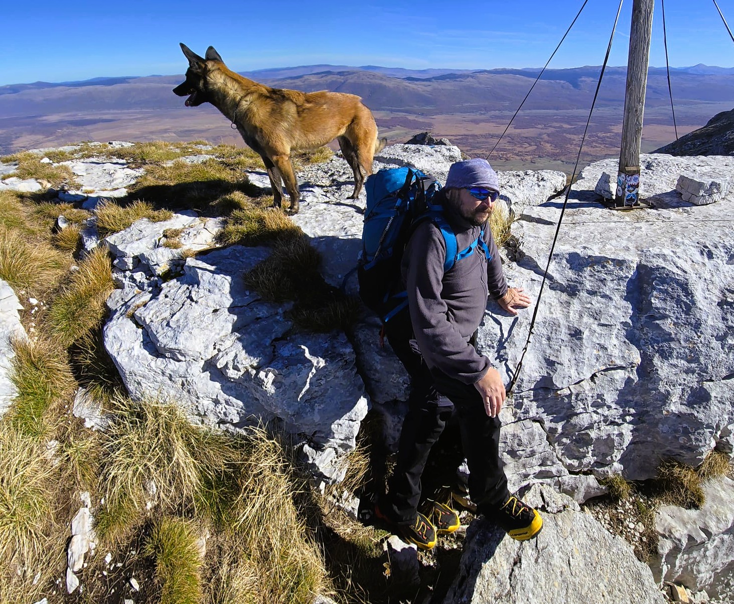 Dalje nastavljamo prema vrhu Troglava gdje stižemo nakon 1,5 sati uspona. Boravak na vrhu traje vrlo kratko zbog jakog vjetra. Ispod samog vrha pronalazimo dobru zavjetrinu koji koristimo za odmor i pregled pasa. Potom započinjemo spust drugom stranom Troglava i koji je zbog umora možda bio i zahtjevniji nego sami uspon. Nakon još 5 sati hoda stižemo do polazišne točke, Sv. Jakova. Ukupno smo prehodali oko 25km i hodali 11,5 sati. I psi i vodiči su završili hodnju bez ozljeda. Ovom se prilikom želimo zahvaliti kolegi iz K9 tima DVD Sinj Petru Šušnjari na vođenju i organizaciji ovog uspona. Uz njega su bili i njegovi potražni psi Gimli i Ria a iz K9 tima DVD Jastrebarsko sudjelovali su Dejan Ranitović i Foxy.